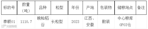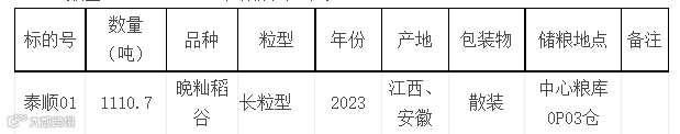 1、品种名称:晚籼稻谷,长粒型;生产年份:2023年;产地:江西、安徽(同一标段必须为同一产地);数量:1110.7吨 ;详细情况如下表: