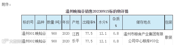 温州粮食中心市场(受托方)受温州市粮食收储有限公司(委托方)委托,兹定于2023年9月15日10:00在温州网上粮食市场(www.zglssc.com)举办网上竞价销售交易活动,现就相关事项公告如下: