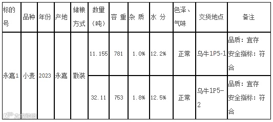 1、品种:小麦,年份:2023年,产地:永嘉,数量:43.265吨,一个标段(详见标的物详情)。