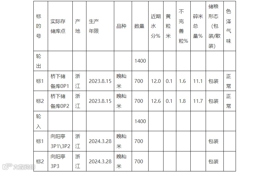 2.轮出标的物:永嘉县桥下粮食库0P1、0P2仓,2023年8-9月加工的晚籼米1400吨,储粮方式:包装,设二个标的。