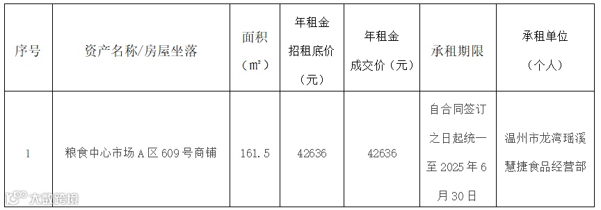 本公司温州粮食中心市场A区609号商铺资产经市评估机构评估,按相关程序审批,现将出租结果公示如下: