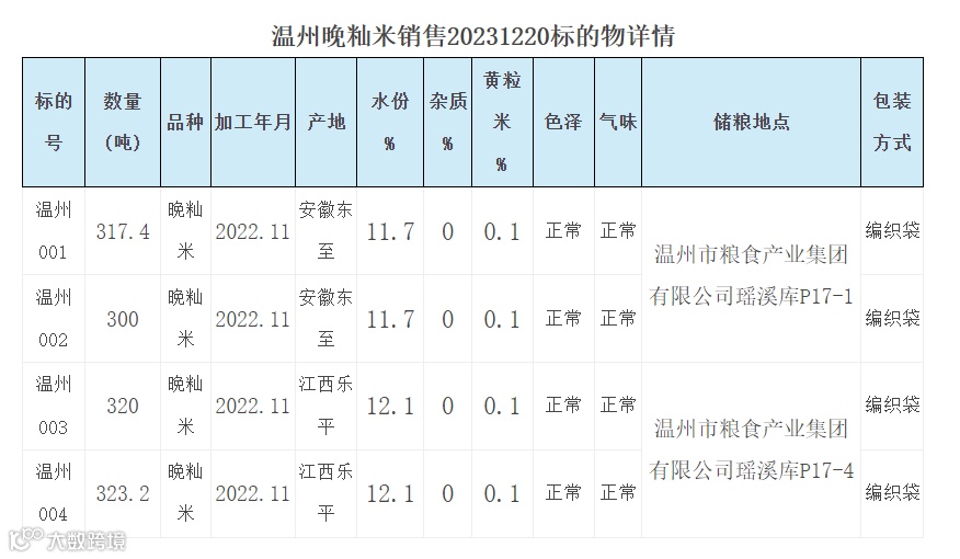 温州市粮食收储有限公司晚籼米公开竞价销售公告(温州晚籼米销售20231220)