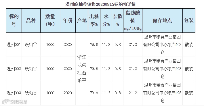 1.品种:晚籼谷,年份:2020,产地:浙江龙湾、江西乐平,数量:3000吨,3个标段(详见标的物详情)。