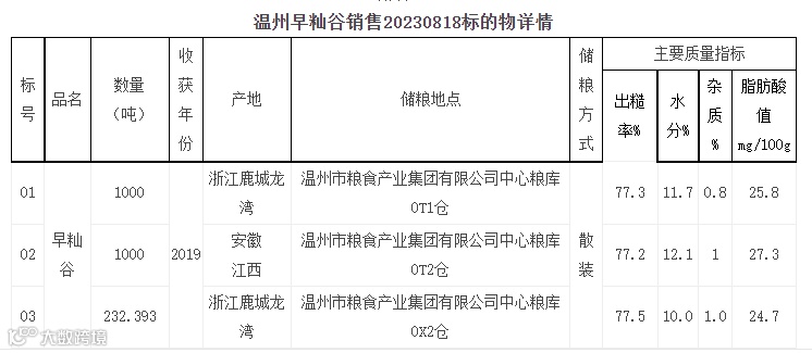 1.品种:早籼谷,年份:2019,产地:浙江鹿城龙湾,安徽江西,数量:2232.39吨,3个标段(详见标的物详情)。