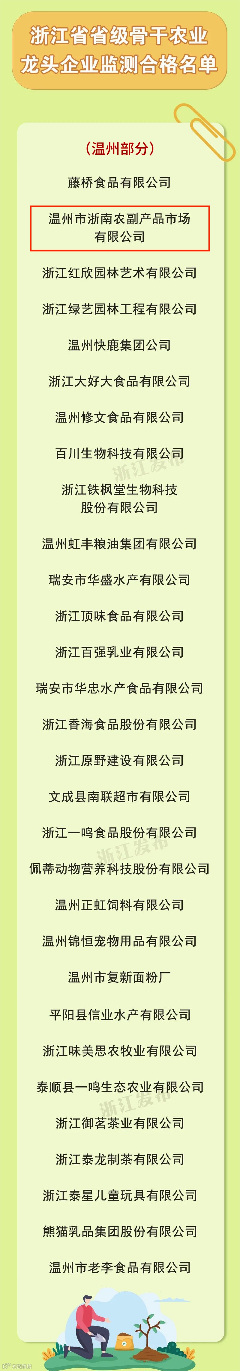 近日,温州市粮食产业集团所属温州市浙南农副产品市场有限公司入围省农业农村厅等4部门公布的省级骨干农业龙头企业名单,继续保留省级骨干农业龙头企业称号。