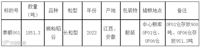 1、品种名称:晚籼稻谷,长粒型;生产年份:2023年;产地:江西、安徽(同一标段必须为同一产地);数量:1851.3 吨 ;详细情况如下表: