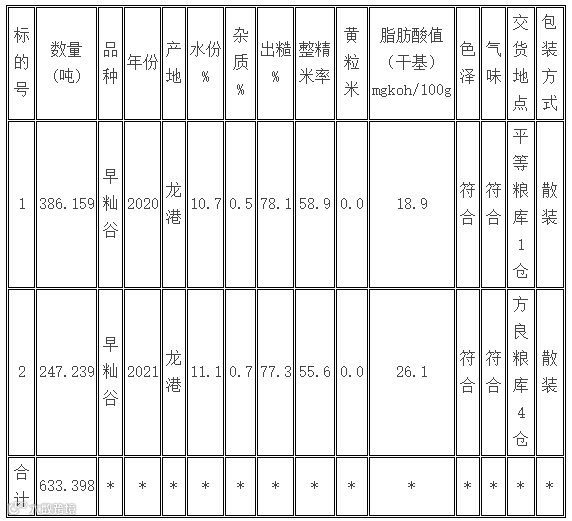 1、品种:早籼谷,时间:2020-2021年;数量:633.398吨;2个标段;详见标的详情。