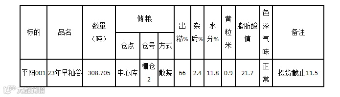 此次竞价销售的标的物为平阳产等外早籼谷总计308.705吨、。