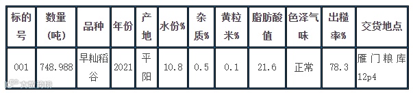 此次竞价销售的标的物为2021年产早籼谷数量748.988吨。(“温州市粮油产品质量检测站”)所出具检验报告仅作参考,具体质量情况以卖方标的物所在仓库实物为准。自主确定是否购买,粮食成交后即视同了解并认可粮食质量,不得再对粮食质量提出异议,并承担竞买后相应的责任和市场风险。