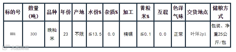 2、数量: 300吨;2022年收获的晚籼谷2023年10月25日后加工的新鲜晚籼米;粒型:同一粒型;加工精度:精碾。