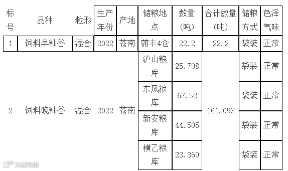 1、本次竞价销售的标的物为2022年苍南产饲料早籼谷22.2吨、2022年苍南产饲料晚籼谷161.093吨,共2个标的(其中蒲丰4仓饲料早籼谷22.2吨;饲料晚籼谷沪山粮库25.708吨、东风粮库67.52吨、新安4仓44.505吨、横乙粮库23.360吨)。质量指标请参考标的物详情