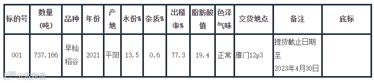 注:质量,以上标的物质量仅供参考。竞买方应在竞价交易前实地查看实物质量,或未进行实地查看实物质量的,竞价交易时都视同全面了解并认可粮食实物质量;成交后均不得再对粮食质量提出异议。