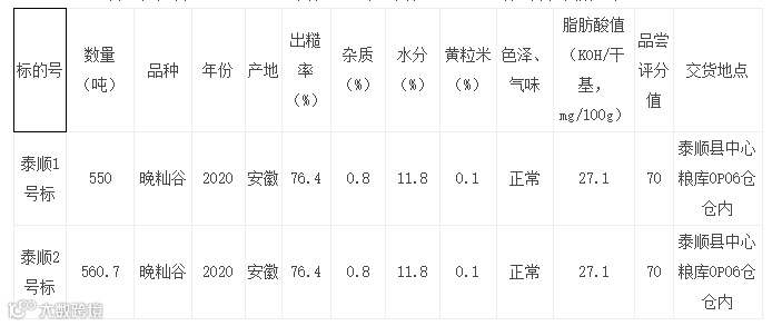 1、2020年产晚籼谷1110.7吨。1号标550吨,2号标560.7吨。标的物详情如下: