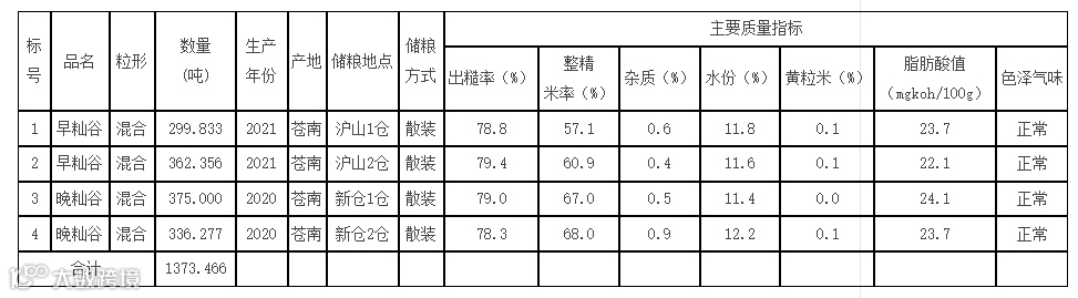 1、本次竞价销售的标的物为2020年-2021年苍南产早籼谷662.189吨,晚籼谷711.277吨,共4个标的。质量指标请参考标的物详情
