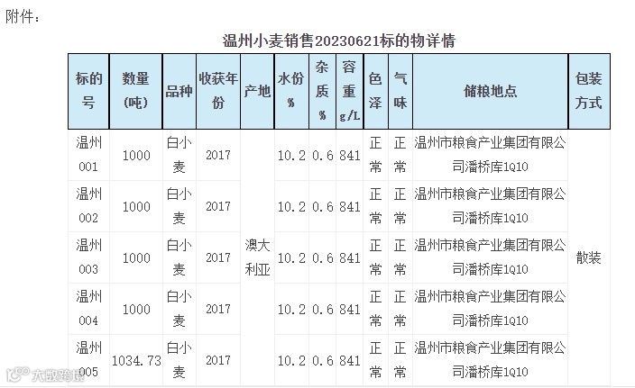 1.品种:白小麦,收获年份:2017,产地:澳大利亚,数量:5034.730吨,5个标段(详见标的物详情)。