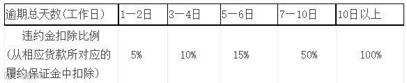 3、委托方不能按约按期交货的,视为违约(由不可抗力情况所导致的交货延期除外)。温州粮食中心市场将把违约部分相对应的履约保证金支付中标方作为赔偿。