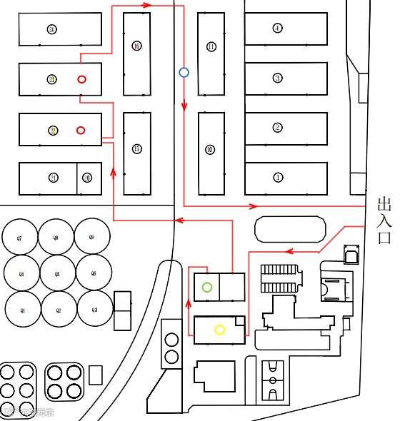ps:黄色区域为休息室 绿色区域为储粮科技馆 红色区域为储粮技术体验区 蓝色区域为趣味活动区