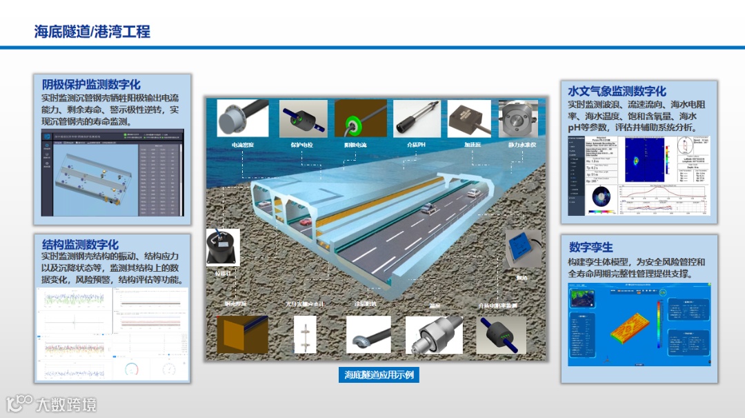 深中通道作为国际首次大规模应用的钢壳混凝土组合结构,设计寿命长达100年,面临诸多挑战。公司积极应对,于2020年完成E32管节防腐健康监测的一年期实海试验验证;2021年顺利完成传感器海上安装及水下电缆布设;现已完成软件开发和联合调试,可为深中通道提供长期有效的健康监测手段,实现100年耐久性的腐蚀监测及评估,助力保障其长期安全运营。