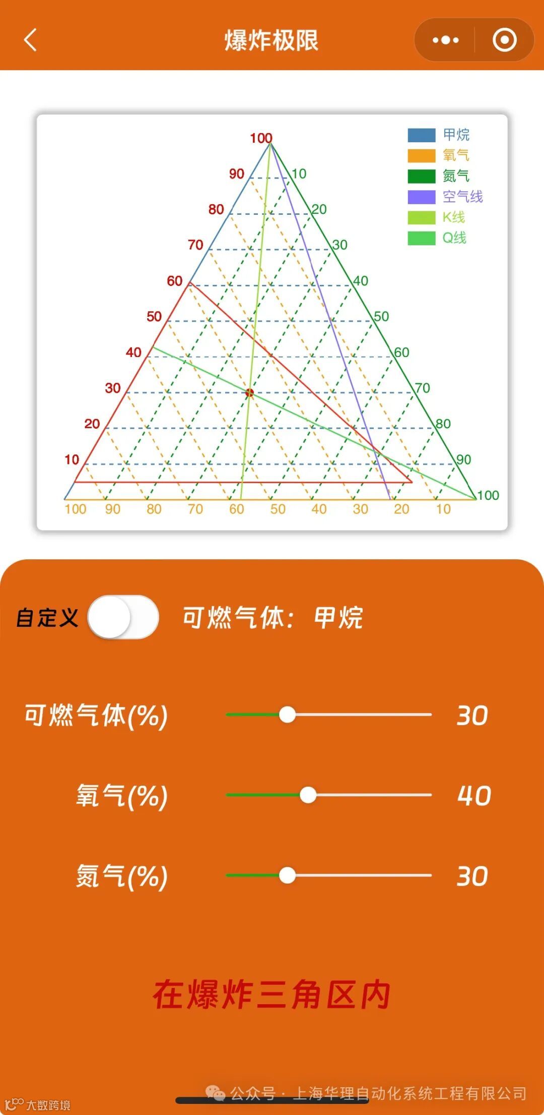 动态绘制爆炸三角区:选择气体后,小程序会在上方坐标轴内动态绘制出该气体的爆炸三角区,直观展示爆炸风险区域。