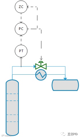在精馏塔的操作过程中,压力对相对挥发度有显著的影响。在较高的压力下,平衡气、液相组成之间的差别减小,分离变得较困难。操作压力降低会使相对挥发度扩大,从而在相同的分离度条件下,减少输入的热量。浮压控制就是为了克服短时间干扰对塔压提供某种控制,同时在长时间内使压力最低。这可以通过如下图所示的浮压控制策略实现。压力控制回路本身具有很强的控制作用,使过程能迅速地从干扰中恢复过来。这样塔压就会紧紧跟踪压力设定值。阀位控制回路应使用弱比例,强积分。这样阀门位置的突然变化就不会引起压力设定值的比例变化,而是使设定值按一定的速度移动。下图的阀位控制回路的设定值应维持在保证压力控制的较小开度。