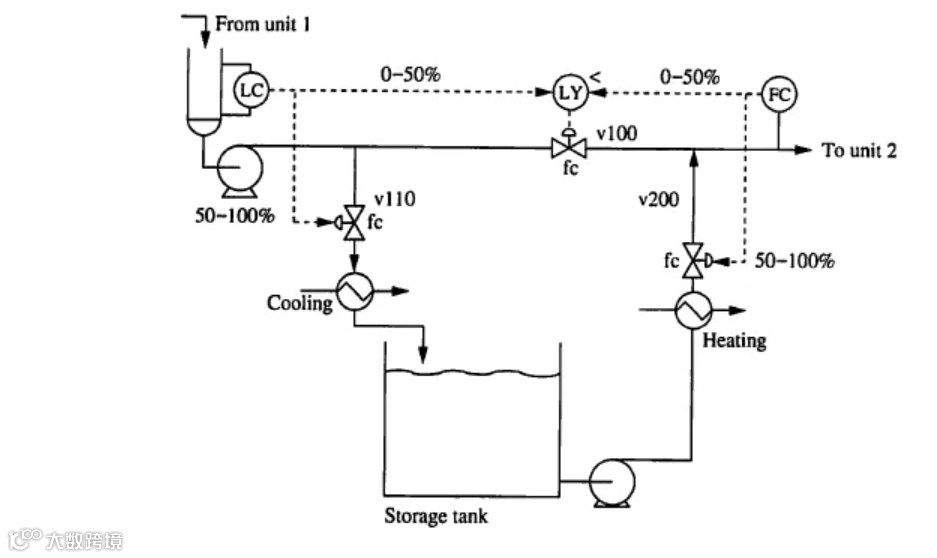 理解设计意图:LC高于设定值V110控制液位,V100控制流量,V200全关。LC低于设定值V110全关,V100控制液位,V200控制流量。
