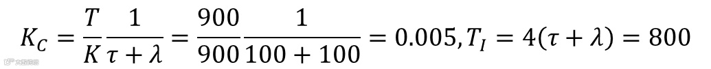 在响应曲线画图可知这是个积分对象,按Lambda整定的画图方法得到等效增益900,等效时间常数900秒,纯滞后时间100秒。