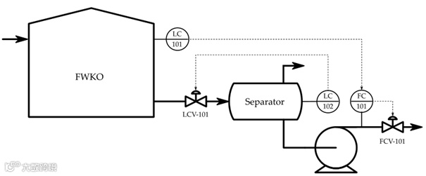 下图的两个液位控制也是嵌套回路,只是它们是两个形式上独立的控制回路,LC102不投自动LC101不生效。此时应该先整定LC102并将其设置在自动控制模式,再整定LC101。大小阀的阀位控制,应该先整定精确控制的小阀相关控制回路并将其设置为自动控制模式,再整定大阀相关控制回路。