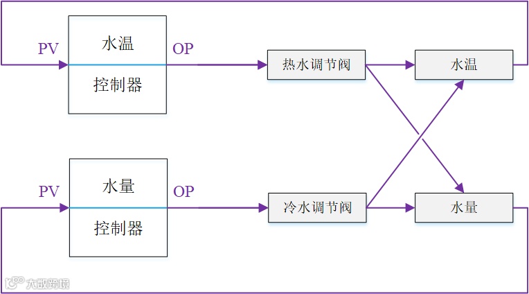 在下图的水温水量控制中,水温和水量两个回路互相影响。如果水温更重要,则要水量控制手动,先整定水温控制回路,在水温控制回路投自动的基础上再整定和投用水量控制回路。即使