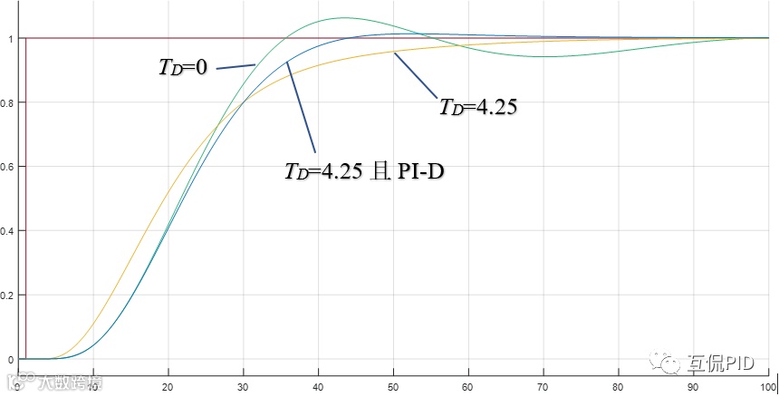 由于被控对象有明显的多容特性,可以选择微分TD=τ/2=4.25,我们选择TD=0、TD=4.25、TD=4.25且采用PI-D形式分别闭环设定值阶跃响应。当TD=0,测量值表现出振荡的特性,这说明对于复杂的被控对象λ选择的稍微大点对闭环响应的稳定更有利。当TD=4.25测量值的瞬时响应明显变快,但是微分在靠近设定值时的抑制能力明显增强,总体表现出控制作用略微不足的现象,另外由于微分的存在当设定值变化时这种情况下控制器输出有很大幅度的跳变,这也是阶跃响应初期瞬时特性变快的主要原因。为了避免设定值变化时控制器输出的大幅度变化,可以选择PI-D形式,即微分只作用于测量值的形式。这种形式也被称为微分先行。当TD=4.25且采用PI-D形式可以避免设定值变化时控制器输出的很大幅度跳变同时改进控制品质。