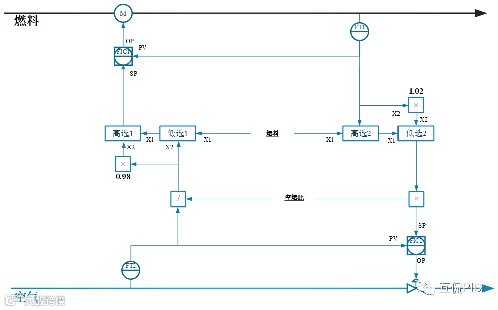 交叉限幅控制主要用于负荷调整频繁,而且特别关注燃烧效率的场合。锅炉、煤气化炉等都有这方面的设计。在石油化工广泛应用的加热炉很少考虑交叉限幅,这主要是因为石油化工燃料多为燃气,正常操作时的过剩空气系数就很低,适当的提高过剩空气系数并不会造成太多能量损失,对这部分能量损失关注不够。