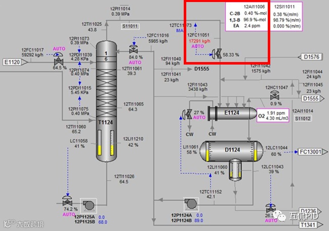 在丁二烯装置的后洗塔,使用塔顶采出12FC11051控制塔顶的顺丁烯含量12AI11006A。顺丁烯含量受到前面主洗塔、精馏塔以及物料的影响波动比较大。这类问题即使使用先进控制也是非常难解决的。这套装置在十几年前就实施了APC,但是这个问题一直没有解决,最近我们取得了突破性进展。