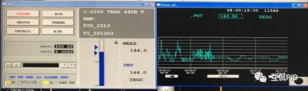 按操作人员的习惯,修改为灵敏板温度控制TIC-221303与再沸器蒸汽流量串级。控制策略修改后灵敏板温度控制品质改善明显,见图 40‑2所示。如果一个精馏塔没有一个温度控制在能量或者物料波动时往往需要操作人员的频繁干预。有一个温度控制回路投自动对精馏塔平稳操作非常关键。