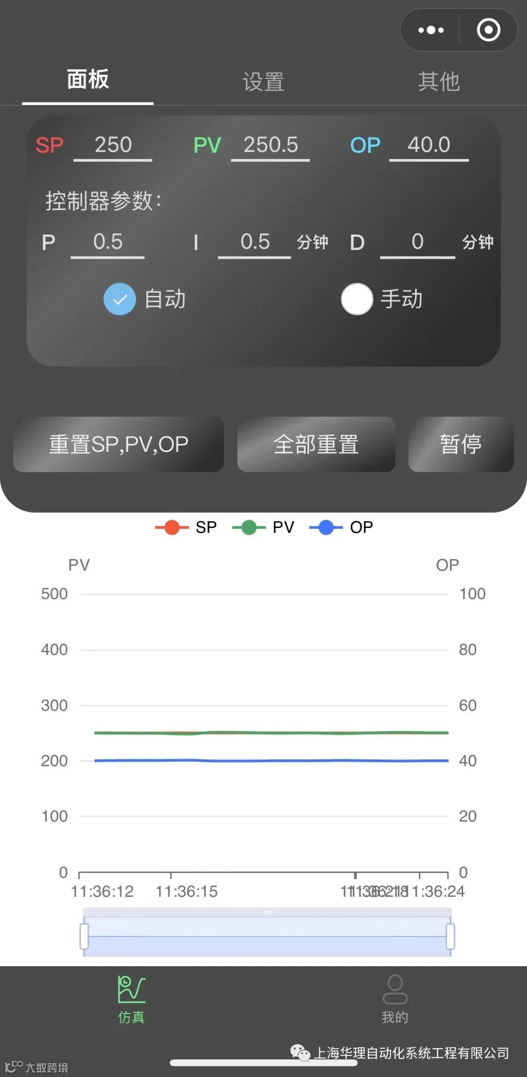 针对这一问题我们曾推出PC端PID仿真器应用程序,在电脑端能实时地动态模拟设定值SP、过程变量PV、控制器输出OP的变化趋势。通过选择过程类型,设置控制参数等若干条件模拟现场情况,通过阶跃测试观察PID参数在对应条件下趋势曲线的变化。这一工具可以让初入行业者或者现场的技术人员随心进行PID整定,有助于更深刻理解PID对装置的作用。