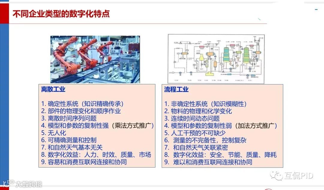 一般来讲,从系统科学的观点来看,离散工业是或者近似是确定性系统,用它的测量变量可以准确地描述对象。知识方面的表述相对来讲也比较确定。比如说做零件加工,可以设计出很好的自动控制系统和机器人,做一个和做100个都可以是质量一致的。这就是可复制性比较高。从方法概念上说,它是一个“乘法”的关系。如果把这些加工机器人用网络连接起来,整个系统的效率就会以倍数的关系来提高,这就是离散工业数字化发展可以更快一些的原因。另外一方面,离散工业和消费互联网关联比较直接和容易。比方说生产家电的流水线可以直接联系到消费互联网客户端,用户直接下单决定产品规格和数量,这样就从节点平方关系到乘法关系,大大的加快了生产和价值实现效率。