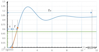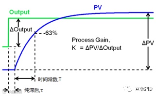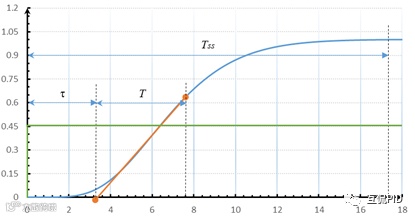 从开环响应的63.2%ΔPV,沿响应曲线向前做响应曲线的切线,切线与时间坐标轴相交。输出变化到交点为纯滞后时间τ,交点到63.2%ΔPV的时间为时间常数T。
