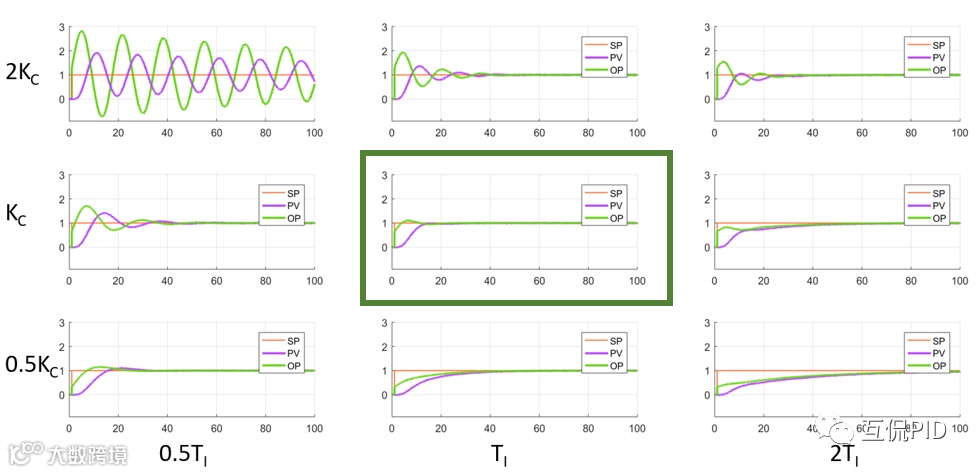 图 6‑1显示了比例和积分时间的差异如何影响PI控制器的响应。正中间的图形为最优参数情况。由图 6‑1可见,随着参数的整定,无论是翻倍还是减半,过程的每一个动态响应都截然不同。左上角的图显示,当比例加倍,积分时间减半时,控制器会产生大而缓慢的阻尼振荡。相反,右下角的图显示,当控制器比例减半,积分时间加倍时,响应变慢,控制回路抗干扰能力不足。