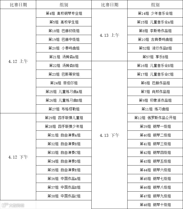 2.参赛选手均需背谱演奏,四手联弹组别允许看谱;