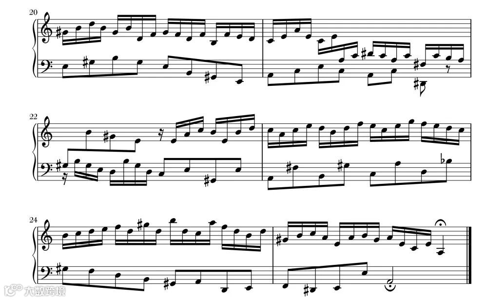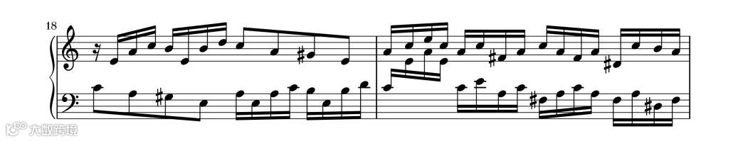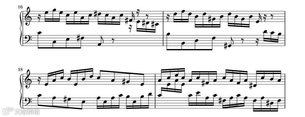 第18小节的主题回到a小调,再次使用了卡农手法,高低声部形成对话感。