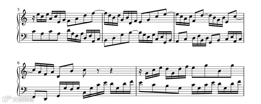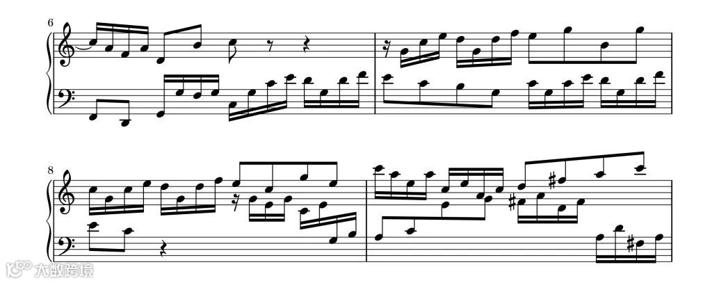 旋律的主题从第6小节后半部分的低声部开始,高声部紧随其后,直至第8小节前半部分结束都使用了卡农手法。