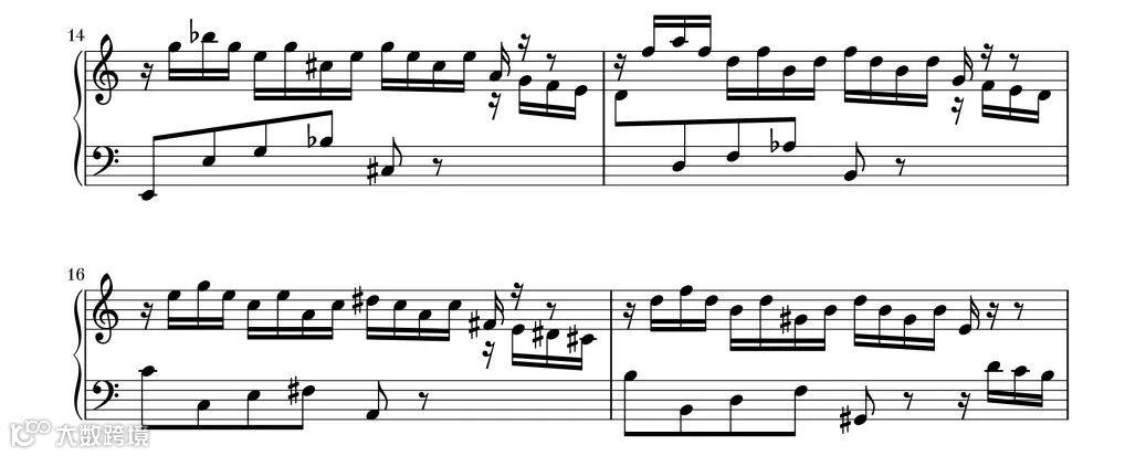 整首作品使用卡农手法,相同的主题与旋律依次出现,八分音符与十六分音符相辅相成,是一首对话感强、具有歌唱性的乐曲。