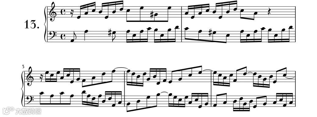 旋律从第11小节后半部分开始变得很有歌唱感,与第5~6小节中的一段旋律是对称的。使用对称手法是巴赫作品的特征之一。