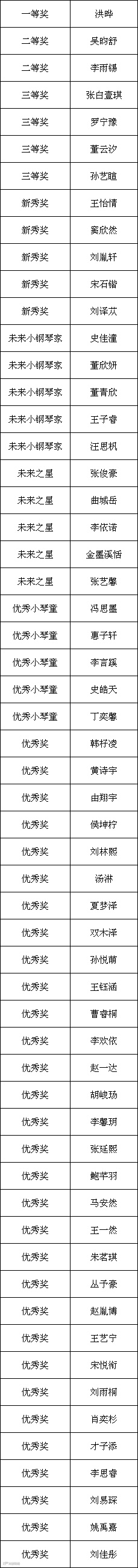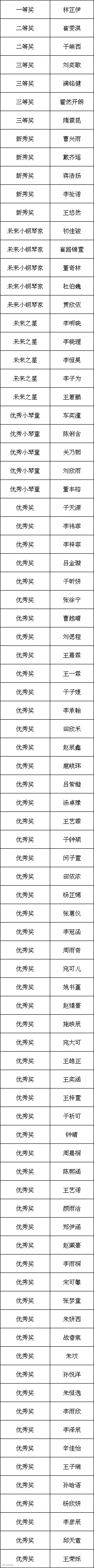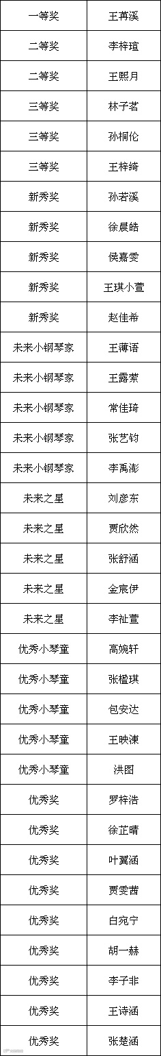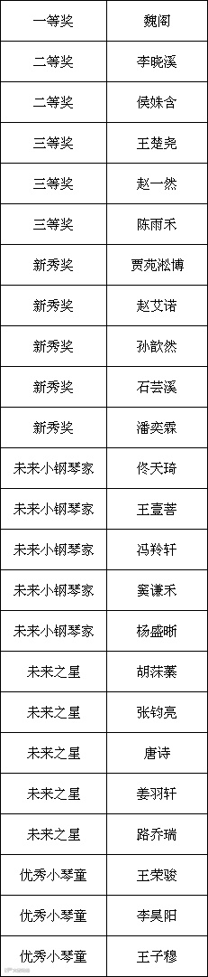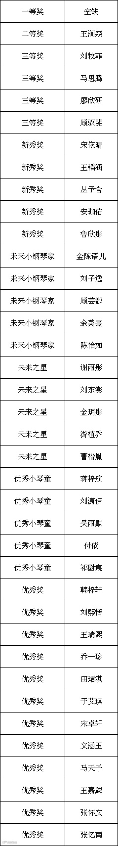 经过前期的网络报名、视频录制、视频上传工作以及后期评委老师们的在线评审工作,第二届雅马哈·旺族杯少儿钢琴大赛的获奖名单公布如下: