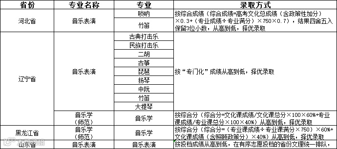 该校2021年在各省(自治区)均不设艺术类专业校考考点,录取使用的专业课成绩为生源所在省(自治区)组织的相应艺术类专业统考(联考)成绩,录取使用的文化课成绩包含高考政策性加分。要求考生艺术类专业相应科目统考(联考)成绩合格,文化课成绩须达到生源省份艺术类高考控制分数线,符合考生所在省(自治区)艺术类投档条件。针对音乐表演及音乐学(师范)录取方式如下: