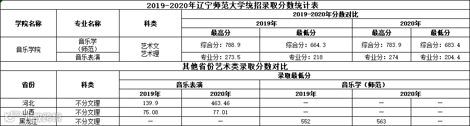2019-2020年辽宁师范大学统音乐表演及音乐学(师范)专业招录取分数统计表 :