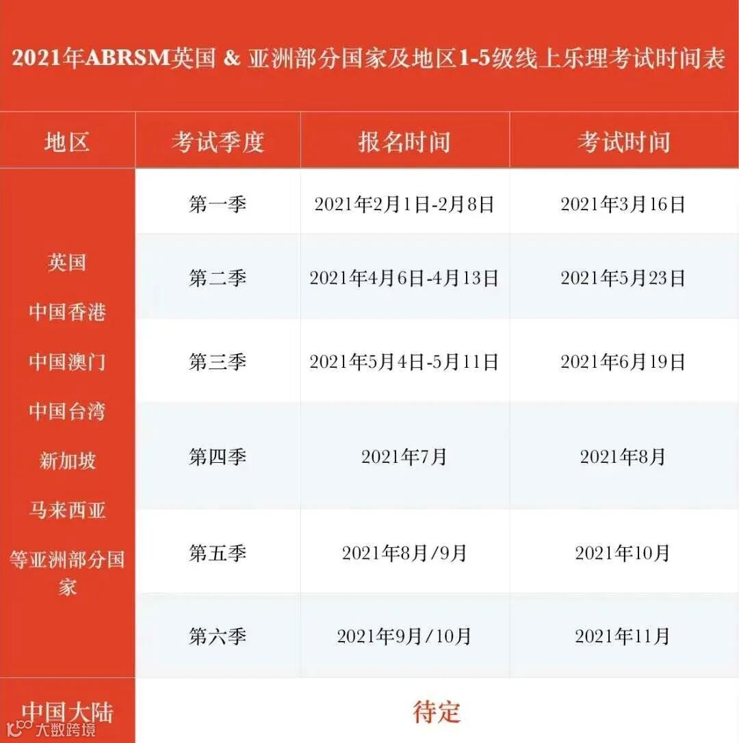 10月份,ABRSM发布2021年演奏和乐理英国本土和亚洲部分地区的“线上、线下”报名及考试时间。虽然目前没有中国内地的考试信息,但线上考试理论上讲全球都可报名。另外香港和澳门的乐理考点有极大可能提供繁体中文的试卷,甚至提供简体中文的试卷,让我们拭目以待!