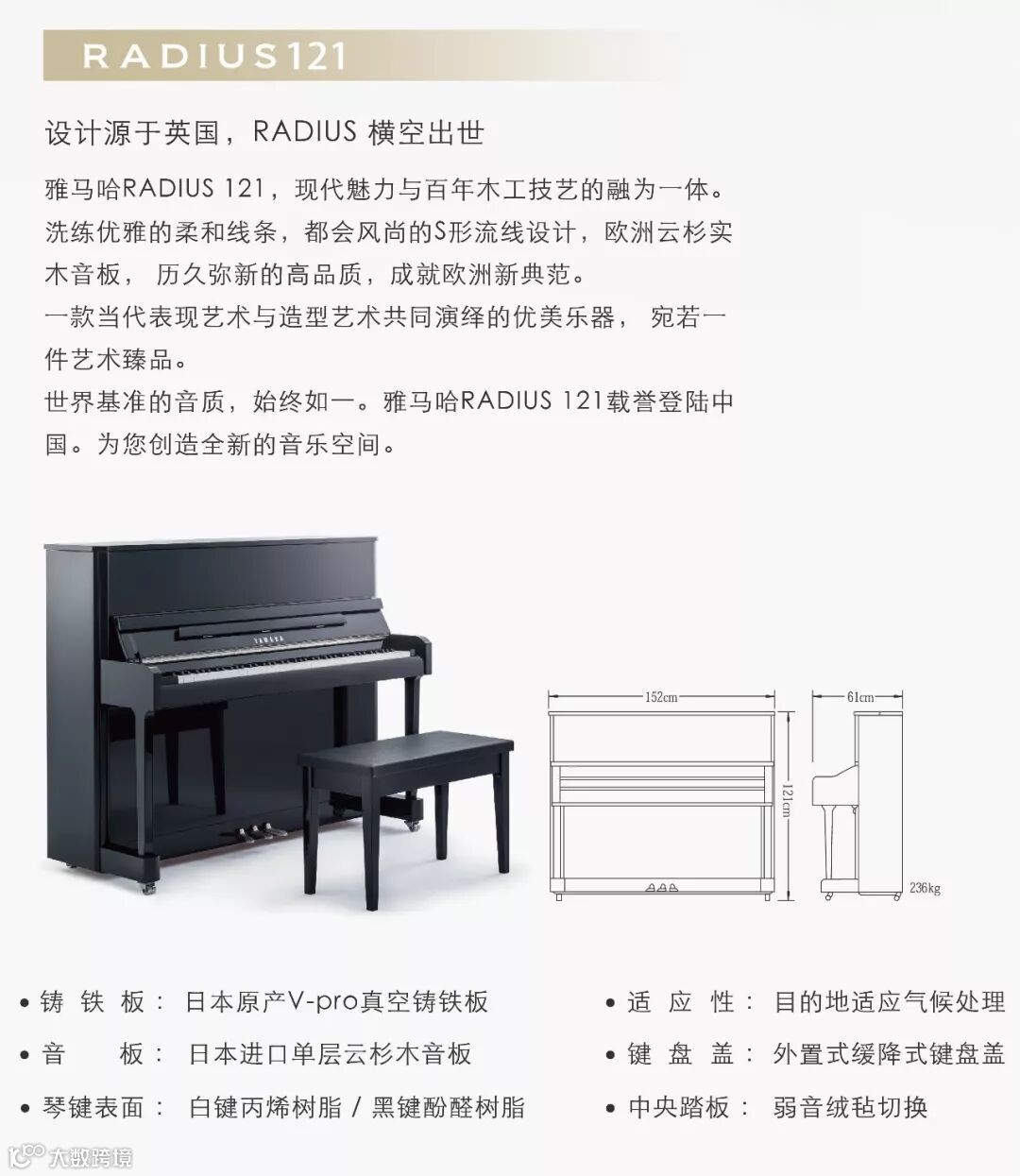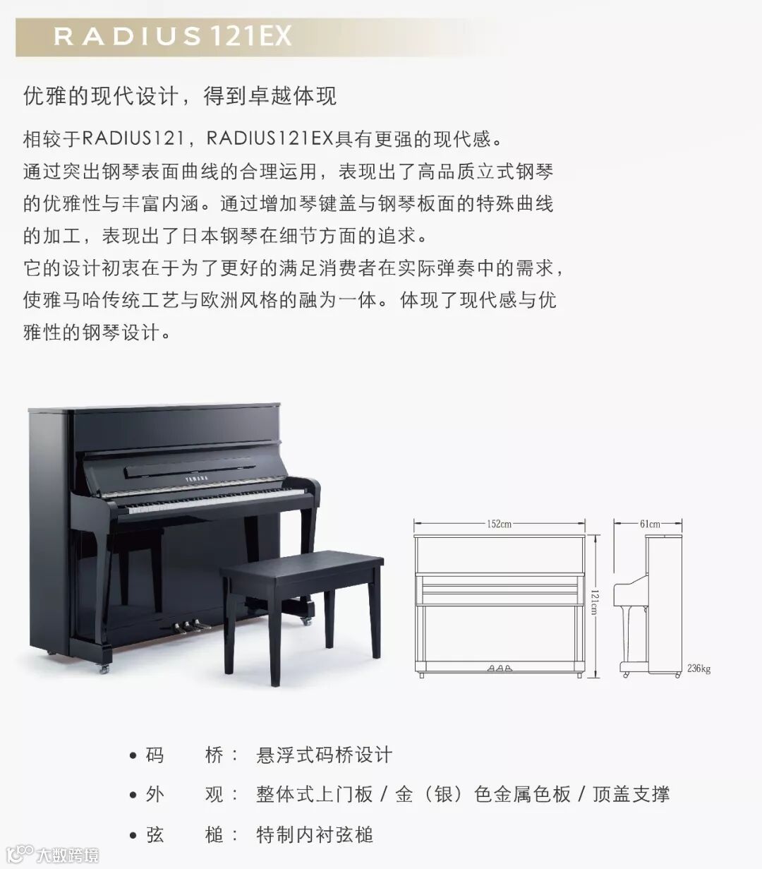 雅马哈RADIUS,现代魅力与百年木工技艺的完美融合。洗练优雅的柔和线条,都会风尚的S形流线设计,云杉实木整音板,历久弥新的世界品质,成欧洲新典范。一款当代表现艺术与造型艺术高品质演绎的优美乐器,宛若一件艺术臻品。世界基准的音质,始终如一,雅马哈RADIUS载誉首登中国。为您创造全新的音乐空间。