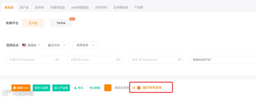 输入目标链接的ASIN,点击立即查询。进入结果页后,点击包含变体按钮