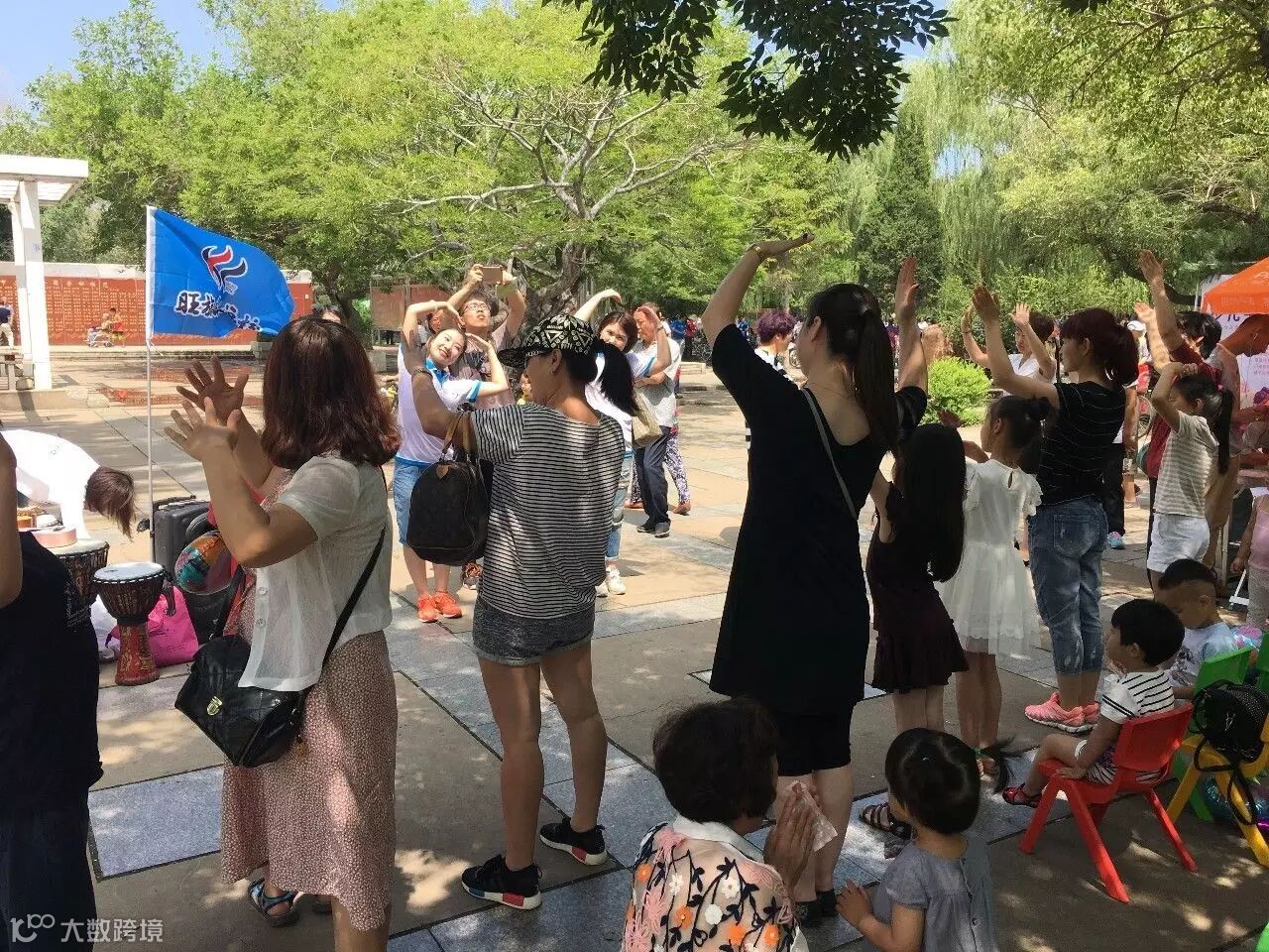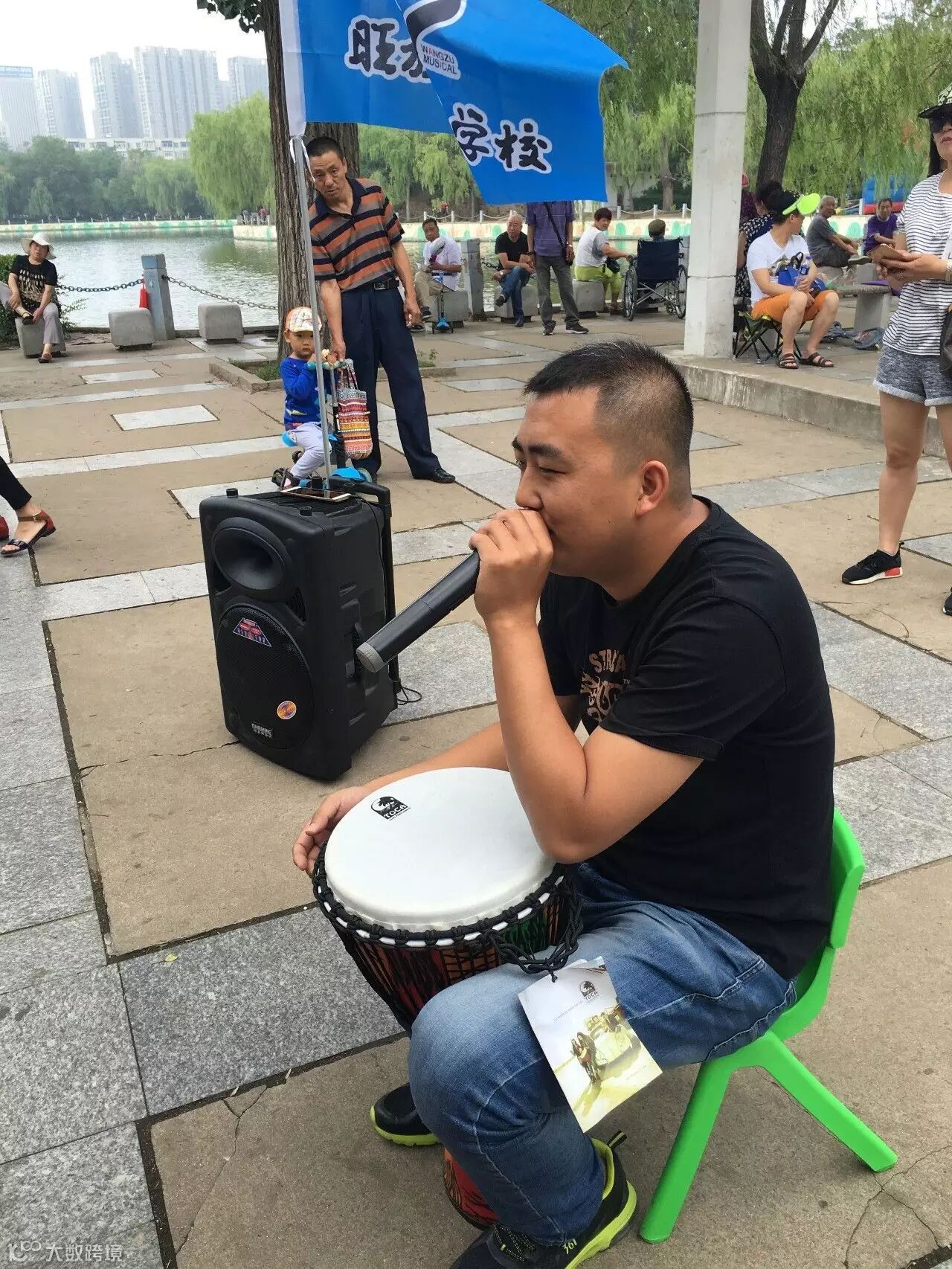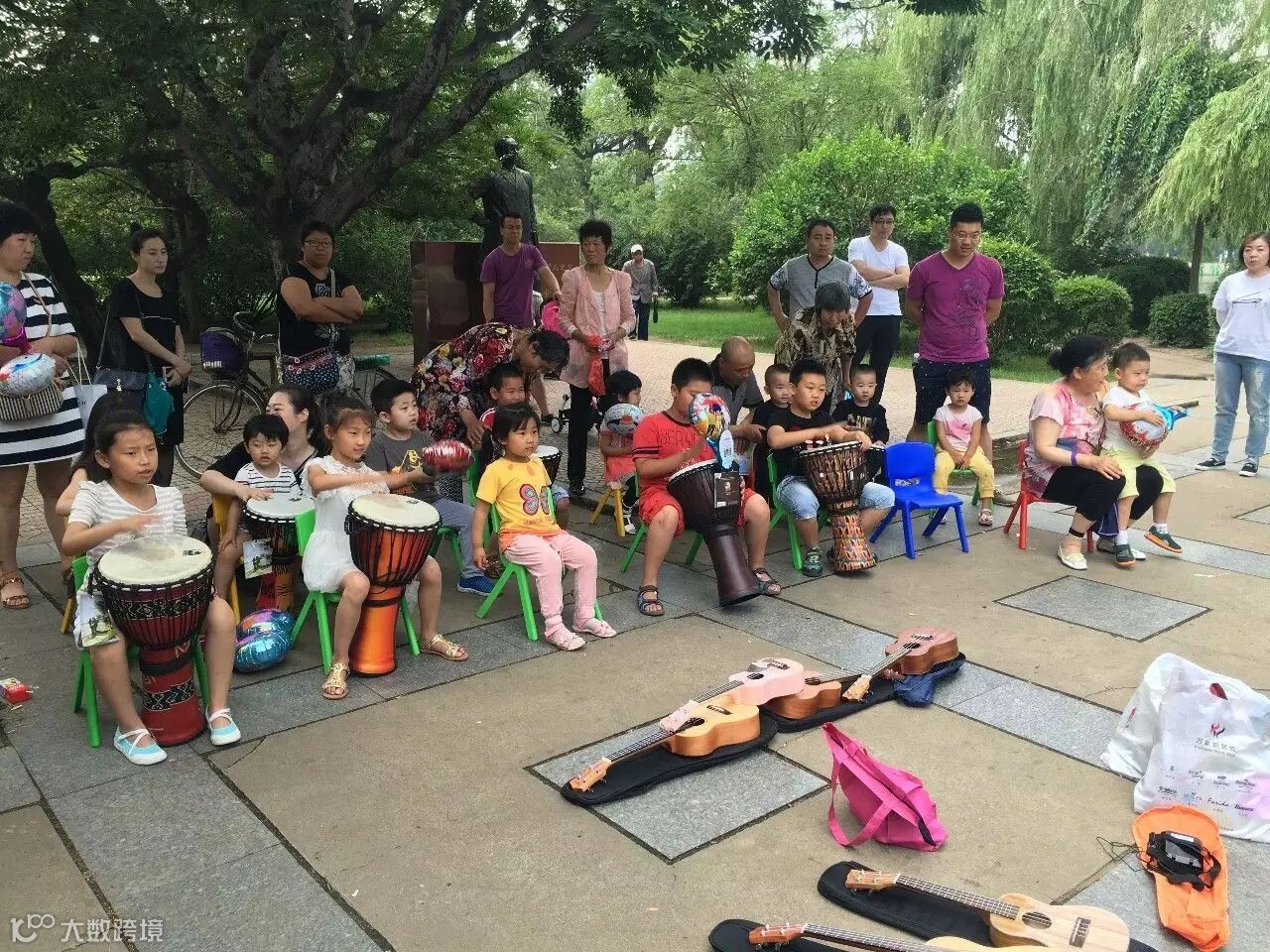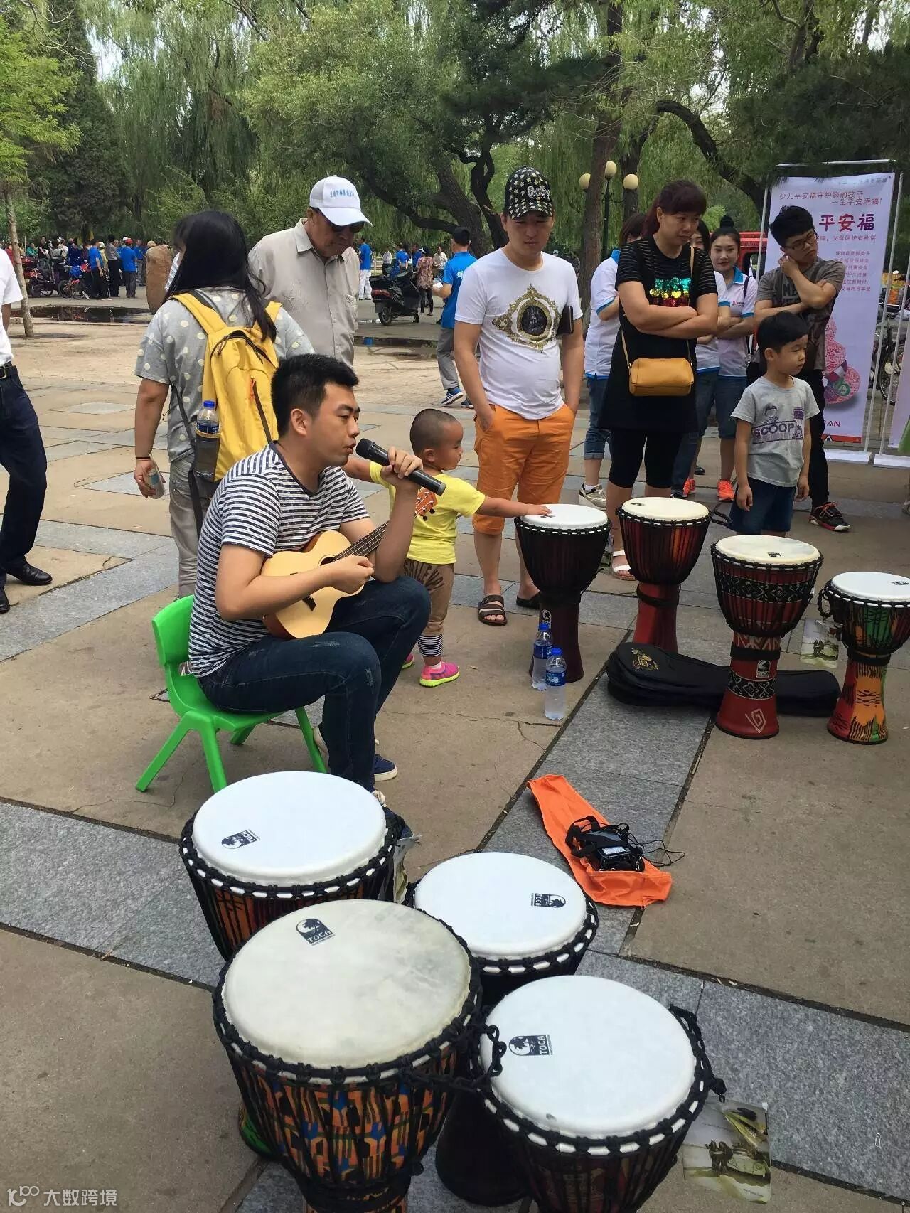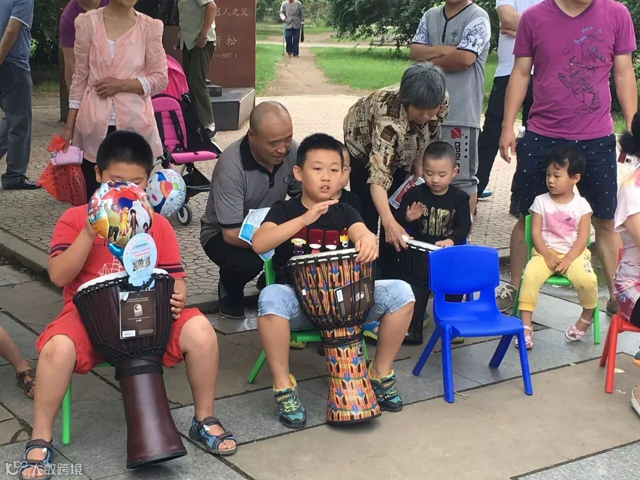 旺族小宇老师也教小朋友们敲打起非洲鼓来,小朋友们和着伴奏音乐,有节奏地敲打着非洲鼓,频频引来路人驻足观看~