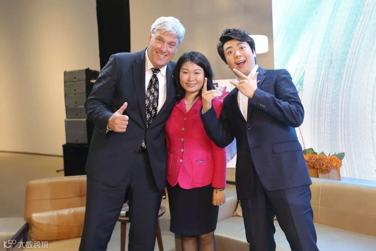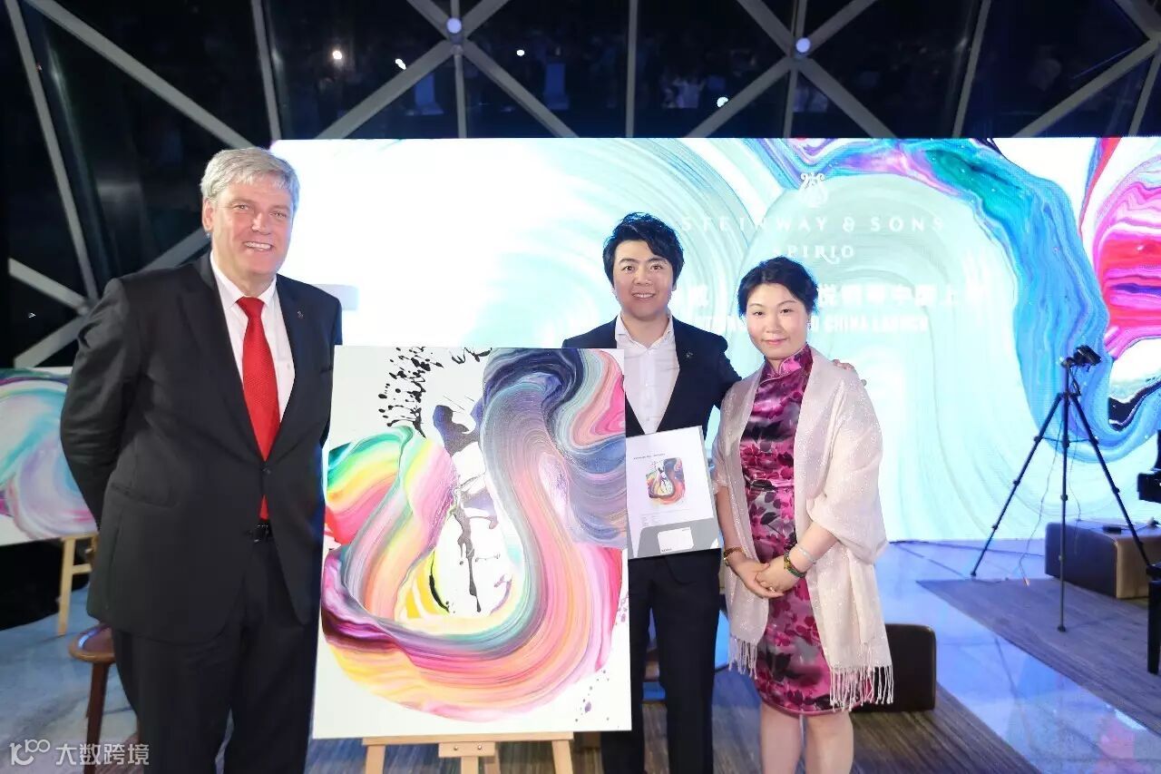 施坦威钢琴亚太总裁胡斯曼先生与中国区总裁位炜女士向郎朗赠送特别的礼物--艺术大师Yago Hortal创作的艺术画作