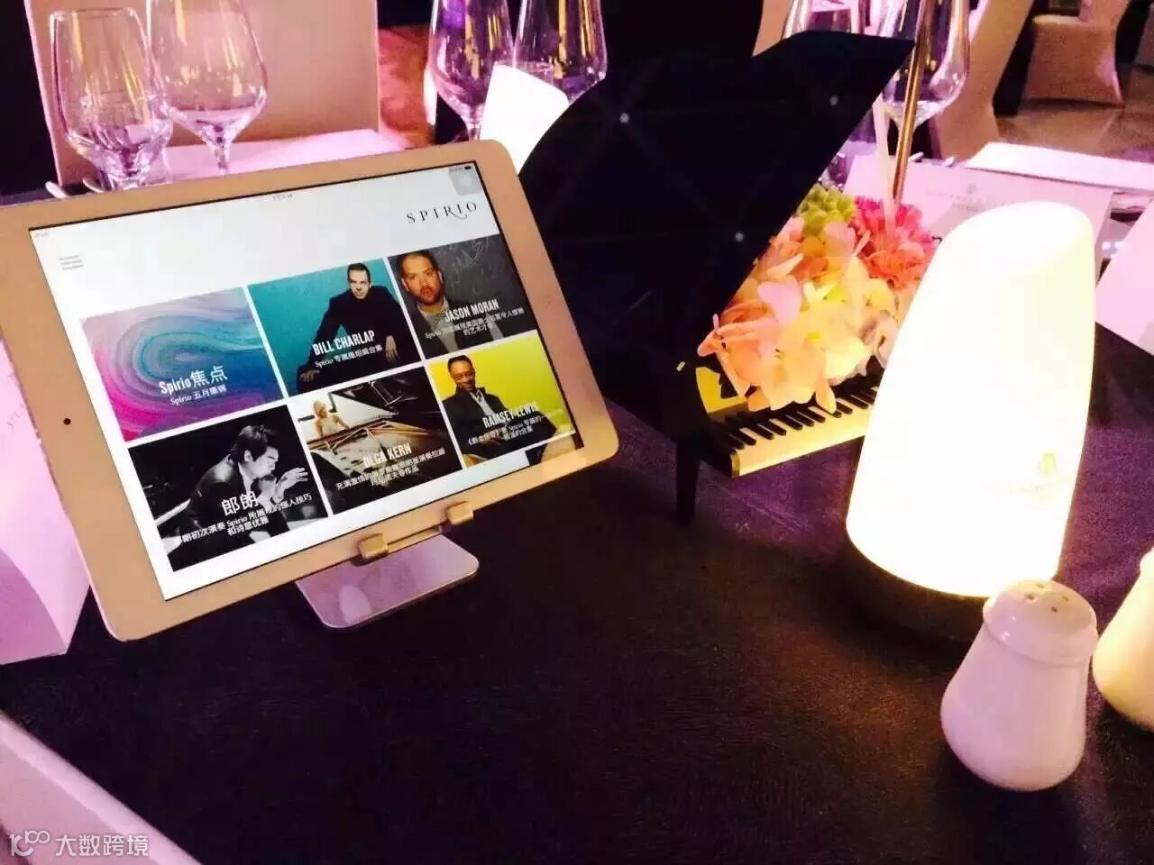 私享晚宴每一桌上配有一个iPad、钢琴桌花以及为SPIRIO特别定制的台灯